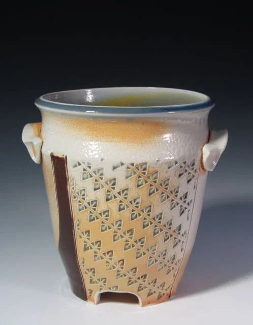 Pottery is very much about the physical interaction with the ceramic object, the balance of a piece in the hand, subtle texture over the surface and how the hand will find and experience these areas in a very direct way. I am interested in how the regimented linear geometric patterns and the repetition of my stamps contrast with and accentuate the curves of the thrown form as well as the organic shapes left by the caress of the soda vapor. This innate mark making that the soda creates has led me to a very organic collaboration with the kiln itself. My stamped patterns are built from a single small triangular element. My goal in the repetition of this single element is for the individual stamp to disappear into the larger rhythms of the pattern. Though the stamping itself is the dominant decorative element, I am also delighted by the negative space created by offsetting the patterning so it locks together and creates a dynamic parallel of the pattern in the negative space between rows. Due to the rather deep impressions I create with the physical act of stamping the inside surface of the vessel bears an echo of the patterning on the exterior.